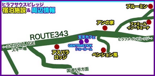 ヒラフ十字路から343号をニセコ町方面に走ると宿泊施設が点在する。道路に面した好アクセスの宿から森林の中にひっそりたたずむ宿まで様々。