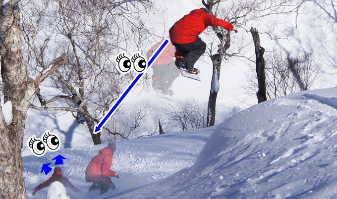 飛び出してランディングに目線を送りながら、ボードを引き付けてグラブします。着地では体全体をバネのようにして衝撃を吸収すると良いでしょう。着地が決まるとたまにアドレナリンが出て頭の中が真っ白になりがちですが、勝負はこれからです。しっかり次に進む方向に目線を送って、自分の安全を確保しましょう。ジャンプ後の方がスピードが増していることを忘れずに!