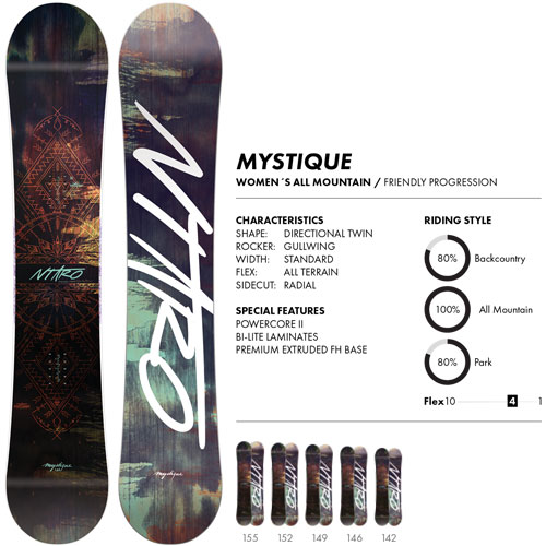 レディース向けオールラウンドボードとして毎年ライダーやユーザーから高評価を得ているMYSTIQUE。人気の秘訣は、あらゆる場面でボードコントロールのしやすいALL TERRAINフレックスをベースに、NITRO社独自のダブルキャンバー構造「ガルウィングロッカー」を搭載していることでしょう。操作性や安定感はそのままに、板の回転性と反発力が向上したガルウィングロッカーに乗れば、ライディング中の様々な動作が楽しくなり、「もっとうまくなりたい」と願うどん欲なガールズライダーのステップアップをミステリアスに演出してくれるはずです!