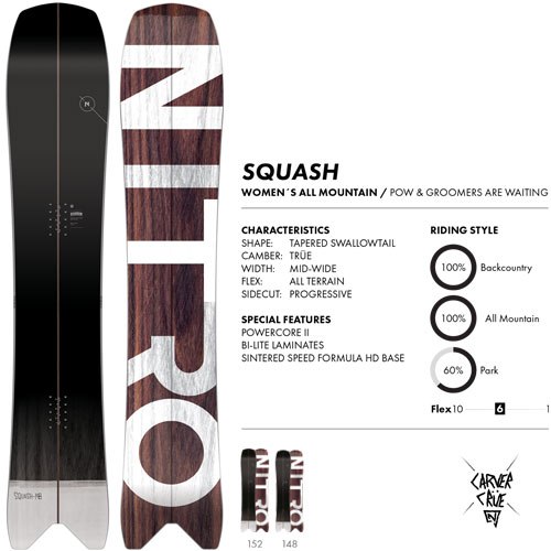 四角いノーズとユニークなスワローテールに、伝統的なキャンバー構造を組み込んだ「スカッシュ」は、パウダーだけでなくカービングでもその威力を存分に発揮!いざ乗ってみると実際のレングスよりも長く感じ、かなりの乗り応え、踏み応えを感じます。「浮いて速くてよくキレる!」と、思いきや、ジャンプでのポップ感もバツグン!世界中のライダーがスカッシュをこぞって愛用し、ターンだけでなくフリースタイルトリックも炸裂させまくっています。乗った分だけ面白さが倍増する奥深いモデル!長年使えるボードをお探しの方にオススメのモデル!今期より待望のレディースサイズが登場!
